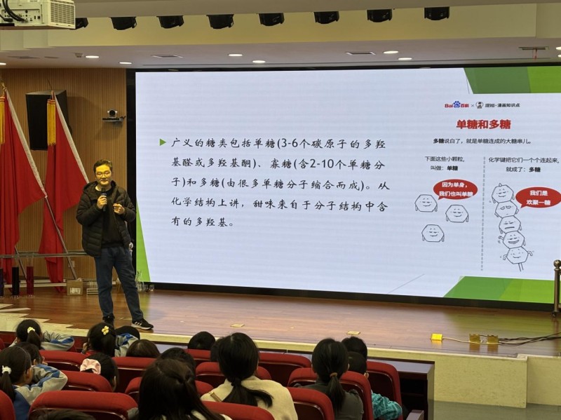 副研究员孙超带来的《话“糖”,一个甜蜜的话题》科普讲座,成为活动的热门环节。孙超凭借扎实的专业知识和通俗生动的表达,从糖类的化学本质、分类及核心生物学功能切入,细致解析单糖的结构特性,层层解锁寡糖、多糖的结构奥秘,让青少年读懂糖类背后的科学逻辑。讲座后的问答环节互动热烈,孩子们围绕“糖与健康”等话题踊跃提问,充分展现出对知识的浓厚兴趣。