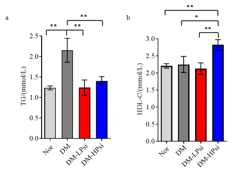 图2 阿果糖浆对小鼠主要血脂指标(TG、HDL-C)的影响