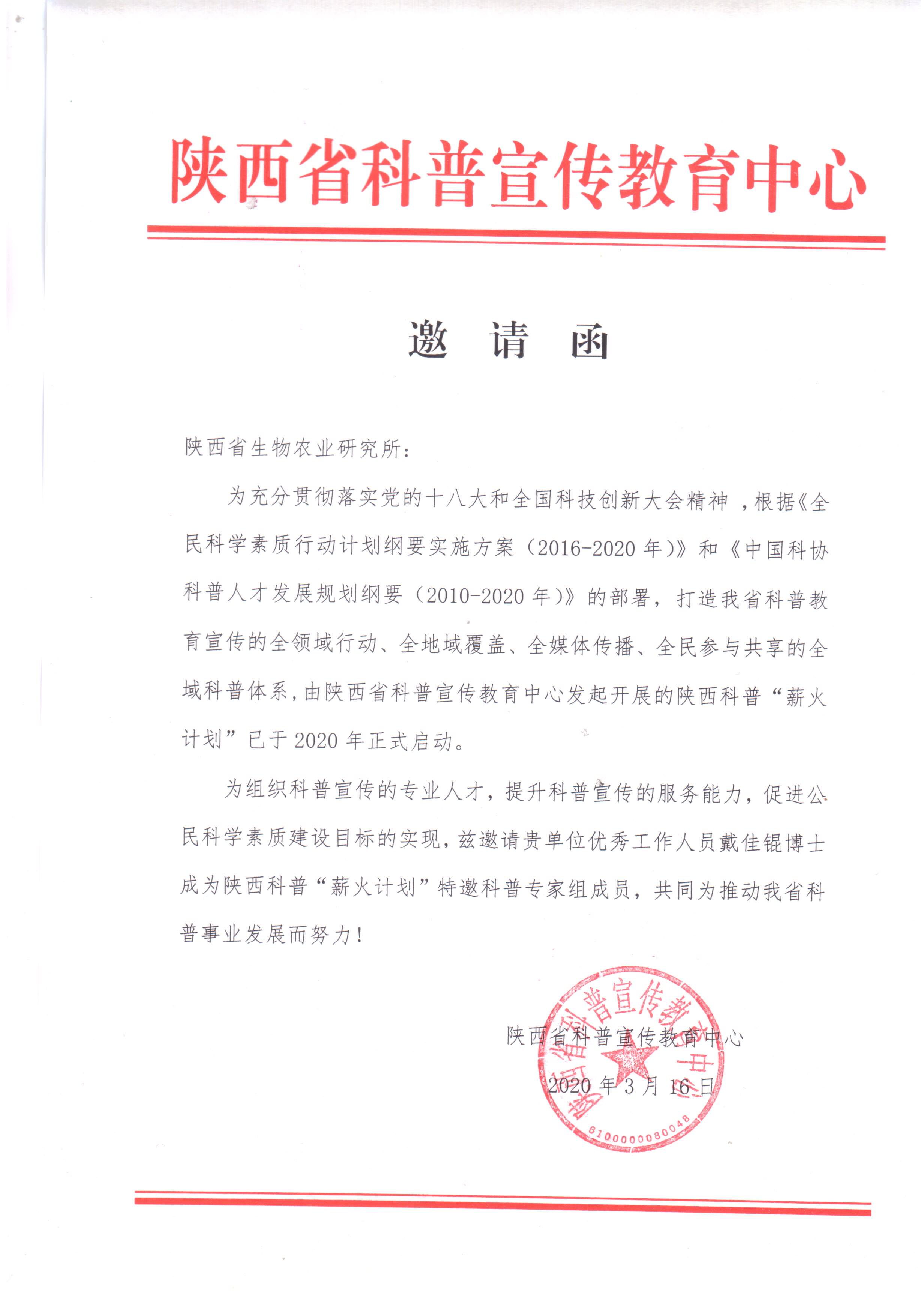 3月16日,陕西省生物农业所青年科研人员戴佳锟博士被聘为陕西科普“薪火计划”特邀专家组成员。