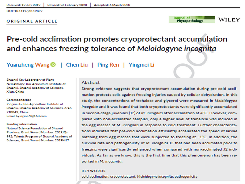 结合南方根结线虫在土壤中的垂直分布规律,及其越冬虫态的研究,来自陕西省生物农业研究所有害生物监测与防控研究中心的研究人员首次揭示4℃驯化处理可显著减轻冷冻(-1℃)处理对南方根结线虫孵化率,以及对二龄幼虫存活率和致病力的影响,而这可能与4℃驯化诱导的冷冻保护剂积累有关。于是,在南方根结线虫冷胁迫耐受机制研究尚处空白之际,该工作将为南方根结线虫在我国北方局部露地安全越冬提供重要参考。相关结果已发表在Journal of Phytopathology上(https://doi.org/10.1111/jph.12897),论文题目为“Pre-cold acclimation promotes cryoprotectant accumulation and enhances freezing tolerance of Meloidogyne incognita”。