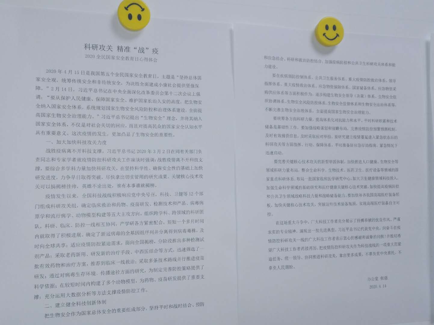 研究所办公室按照要求,收集整理专题学习资料《求是》2020 年第 5 期《习近平:全面提高依法防控依法治理能力 健全国家公共卫生应急管理体系》、《求是》2020 年第7 期《习近平:在湖北省考察新冠肺炎疫情防控工作时的讲话》、《习近平论科技创新(2020)》,并制作了国家安全教育ppt,在生物农业所微信群及QQ群发布。在研究所网站首页“图片新闻”栏目及“科普宣传”栏目开设“全民国家安全教育日”宣传专栏,进行全民国家安全教育宣传及教育活动。