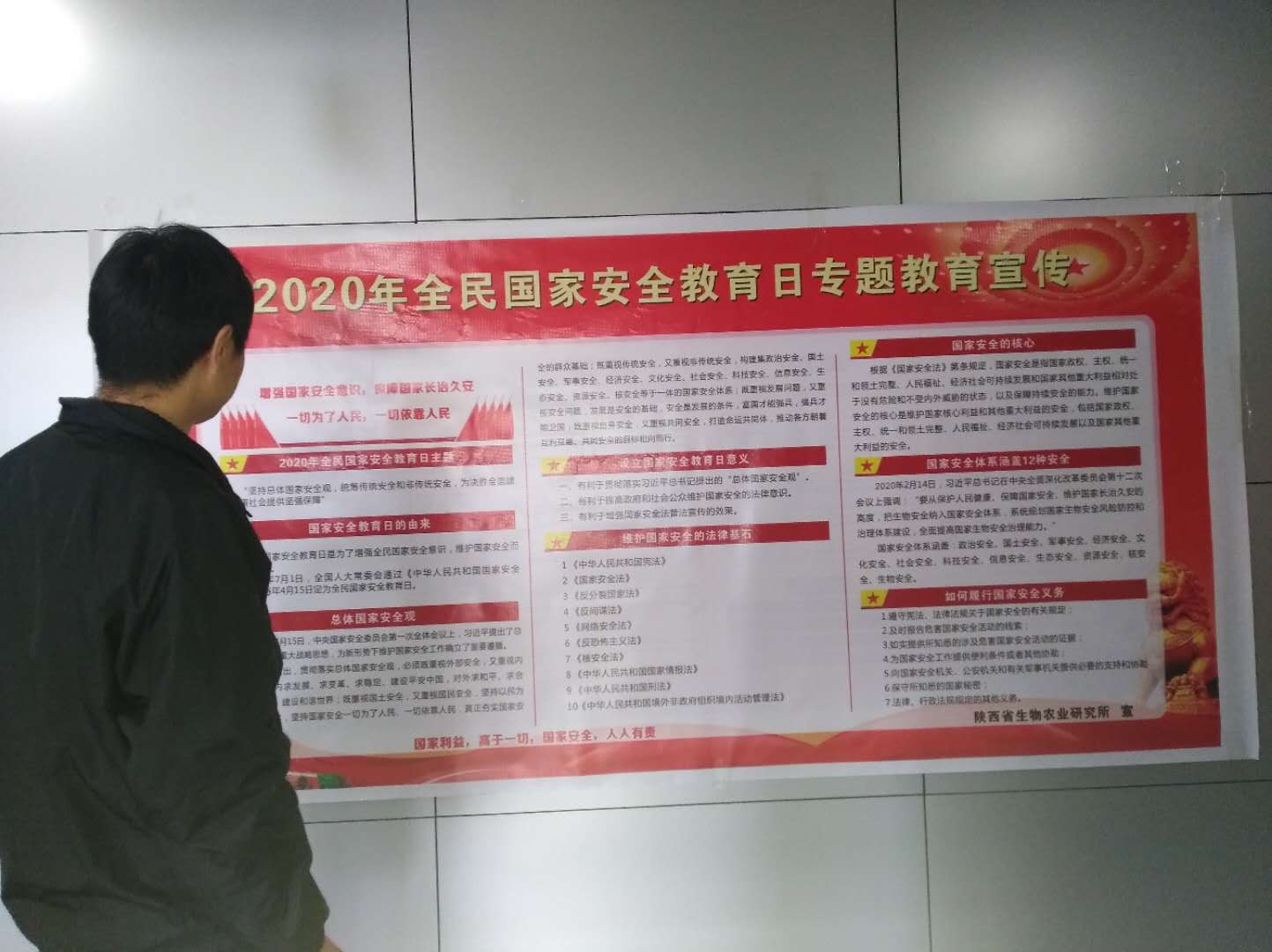 2020年4月15日是我国第五个“全民国家安全教育日”。按照《中国科学院西安分院 陕西省科学院关于组织开展2020年全民国家安全教育日宣传活动的通知》(分省院发〔2020〕5号)文件精神,围绕本次活动主题“坚持总体国家安全观,统筹传统安全和非传统安全,为决胜全面建成小康社会提供坚强保障”,生物农业所紧密结合实际,一手抓疫情防控,一手抓科研管理,于4月9日-16日开展了“全民国家安全教育日”专题学习教育系列活动。