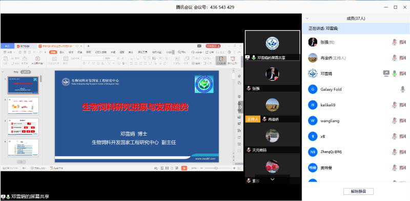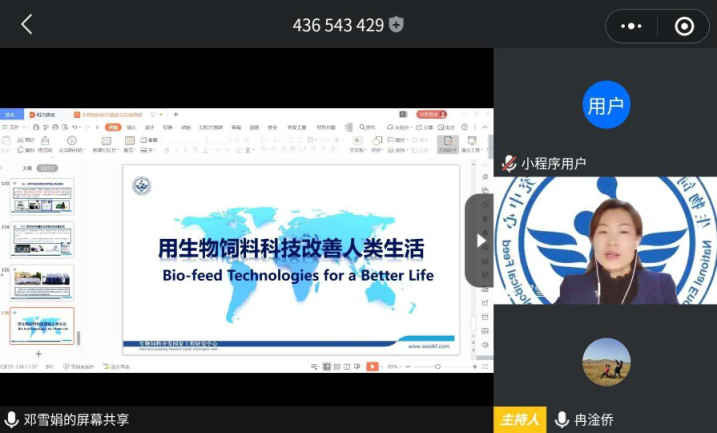 应省生物农业研究所的邀请,4月25日下午,生物饲料开发国家工程研究中心副主任邓雪娟博士通过视频会议,与研究所科研人员进行学术交流,并作了题为“生物饲料研究进展与发展趋势”的学术报告。省生物农业研究所,省饲料工作总站,延安职业技术学院及多家生物饲料企业等单位40多人参加此次“线上”学术交流会。冉淦侨博士主持会议。