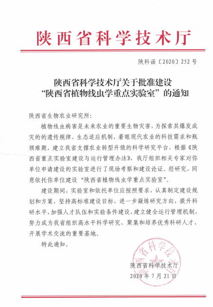 日前,以陕西省生物农业研究所为依托的陕西省植物线虫学重点实验室获得陕西省科学技术厅的批准建设,陕西省植物线虫学重点实验室的发展进入了一个新阶段。