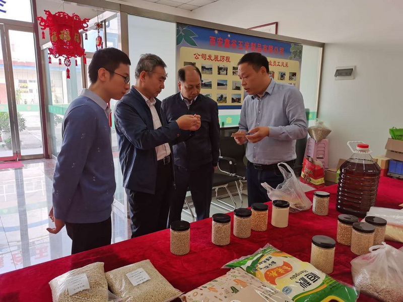 徐升运一行首先调研了位于阎良区北屯镇的西安鑫谷玉米加工有限公司,在杨建华总经理的带领下,参观了企业生产车间,深入了解了现有产品的特性和存在不足,并探讨共同开发精深新产品的思路和设想。