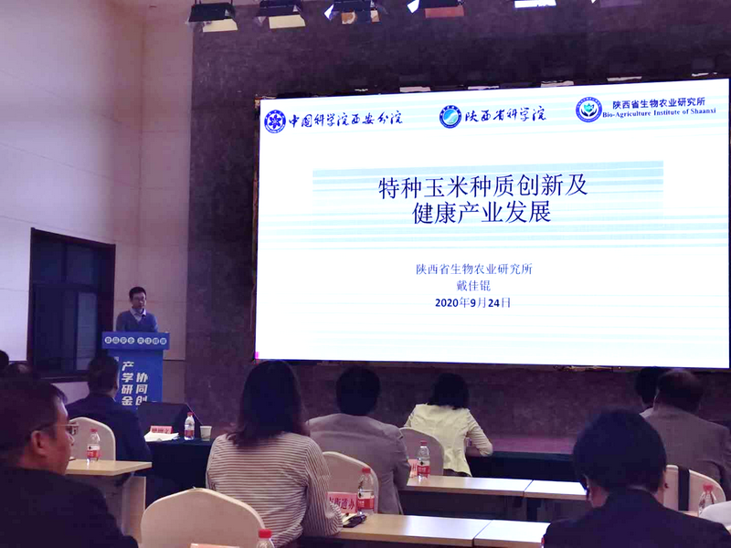 在开幕式上,阎良区科技和工业信息化局负责人宣读了《阎良区促进科技成果转移转化的若干意见》,强调了阎良区加大科研成果落地的决心和激励措施,鼓励科研院所与企业发挥优势互补,促进协同创新,助力经济发展。在“发挥科技创新引领作用,助力食品产业健康发展”科技交流环节,生物农业研究所戴佳锟博士做了题为“特种玉米种质创新及健康产业发展”的主题演讲。