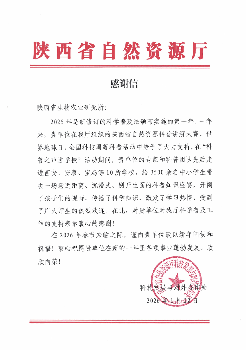 近期,生物农业所收到陕西省自然资源厅感谢信。