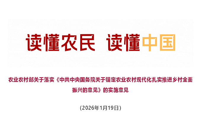农业农村部关于落实《中共中央国务院关于锚定农业农村现代化扎实推进乡村全面振兴的意见》的实施意见农业农村部关于落实《中共中央国务院关于锚定农业农村现代化扎实推进乡村全面振兴的意见》的实施意见(2026年1月19日)各省、自治区、直辖市农业农村(农牧)、畜牧兽医、农垦、渔业厅(局、委),新疆生产建设兵团农业农村局,部机关各司局、派出机构、各直属单位:2026年是“...2026-02-06