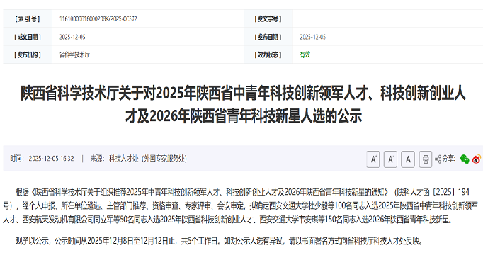 近日,陕西省科学技术厅下达《陕西省科学技术厅关于对2025年陕西省中青年科技创新领军人才、科技创新创业人才及2026年陕西省青年科技新星人选的公示》,陕西省生物农业研究所青年科研人员辛东林博士成功入选 2026年度陕西省青年科技新星。辛东林博士长期从事农林废弃物高值化利...