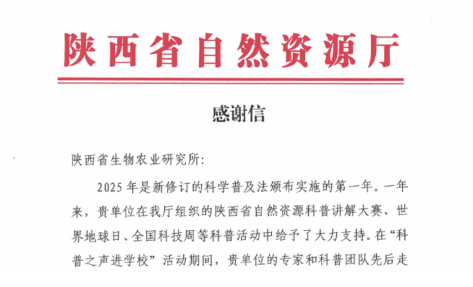 科普赋能,逐梦奋进——研究所科普工作受到陕西省自然资源厅肯定近期,生物农业所收到陕西省自然资源厅感谢信。2025年,生物农业所携手陕西省自然资源厅,将科普的足迹踏入省内多所学校,把科学的种子播植于孩子们的心田。一系列精彩绝伦的科普报告,引领莘莘学子遨游知识海洋;一场场别开生面的实验秀,让复杂的科学知识“可见可感”。这些...2026-02-02
