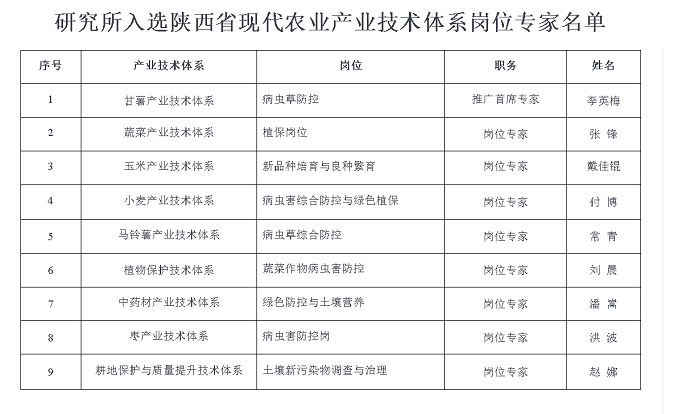 生物农业所9名专家入选陕西省现代农业产业技术体系岗位专家近日,陕西省农业农村厅印发《2026-2028年陕西省现代农业产业技术体系名单》,全省共设立37个产业技术体系。陕西省生物农业研究所9名专家成功入选,涵盖小麦、玉米、蔬菜、甘薯、马铃薯、中药材、植物保护、枣产业、耕地保护与质量提升多个领域,李英梅研究员任推广首席专家,...2026-04-08